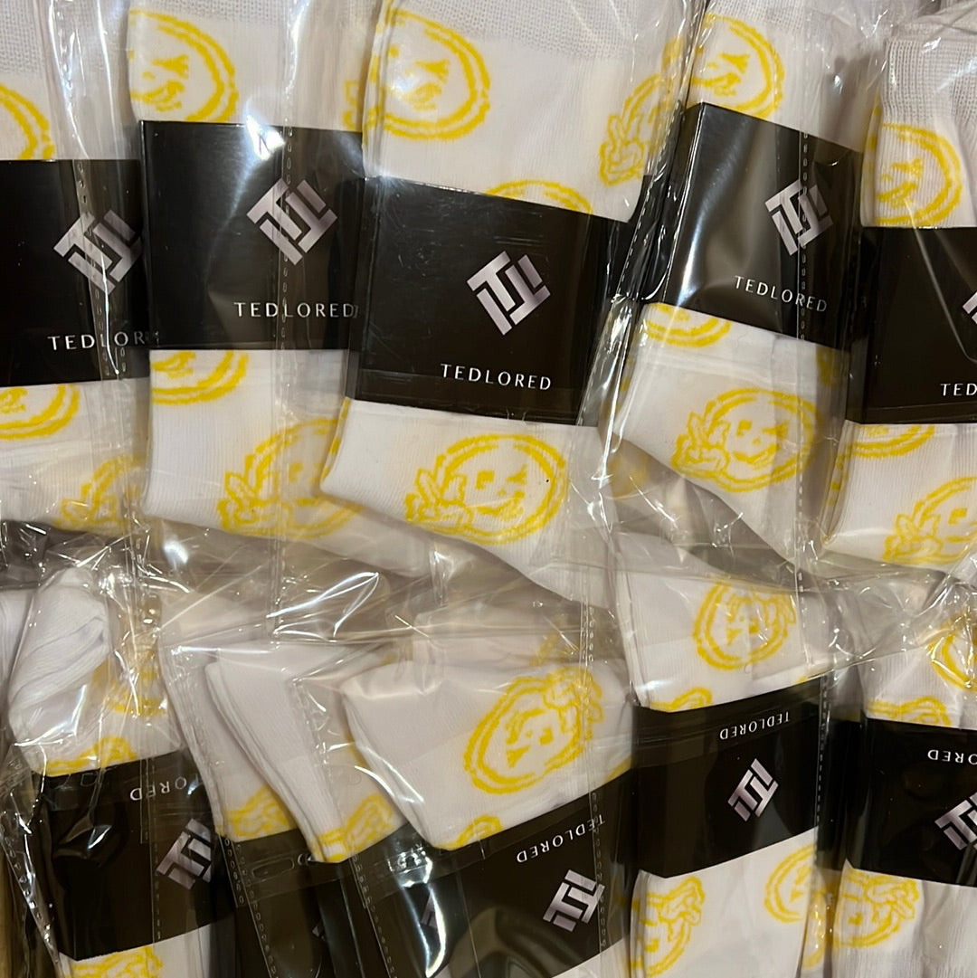 White socks with yellow smiley faces all over. "PEACE" written on the soul of it. 80% cotton, 18% polyester, 2% spandex. One size fits most.